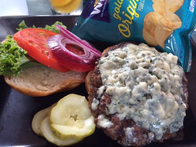 Smothered in fresh Bleu Cheese. Served on a fresh roll with lettuce, tomato, onion, pickles and chips.
